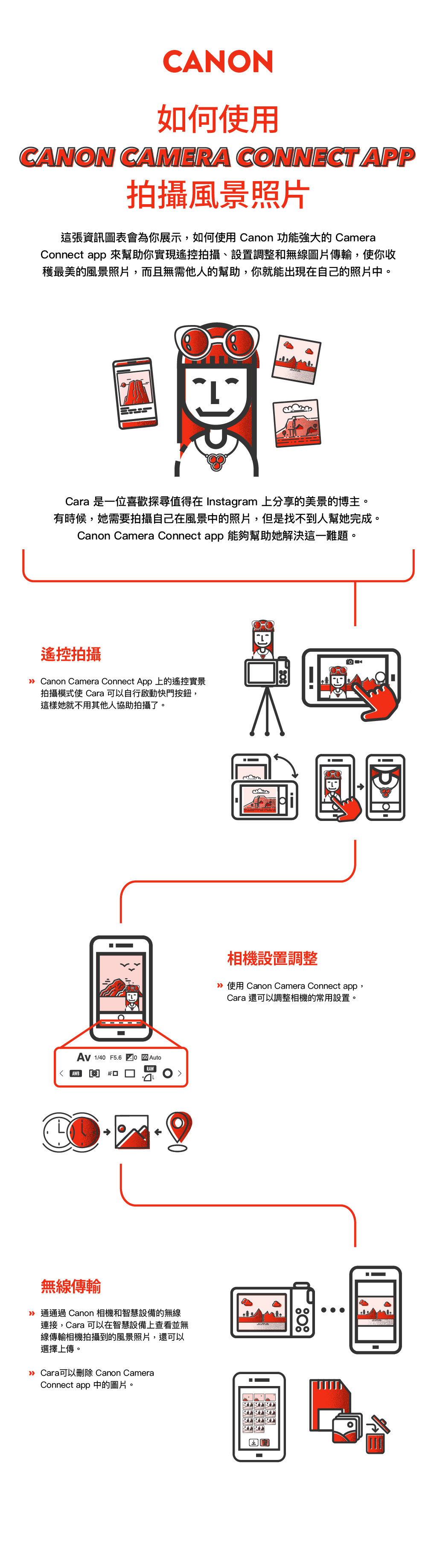 如果你想要拍攝帶有自己特寫鏡頭的風景照片,那麼你需要其他人來説明你完成拍攝。這張資訊圖表會為你展示,如何使用 Canon 功能強大的 Camera Connect app 來幫助你實現遙控拍攝、設置調整和無線圖片傳輸,使你收穫最美的風景照片,而且無需他人的幫助,你就能出現在自己的照片中。