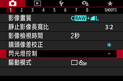 尋找拍攝選單下的「閃光控制」(Flash control)或「外接Speedlite控制」(External Speedlite control),然後找出「外接閃光燈功能設定」(External flash func. setting)或「閃光燈功能設定」(Flash func. setting)。