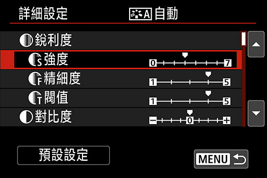 您可以自訂相片風格的預設設定。在「詳細設定」選單中選擇「銳利度」、「對比度」、「飽和度」和「色調」,便能進行微調,取得您想要的效果。