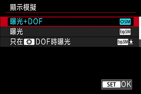 選擇「曝光+DOF」,然後按下 SET 按鈕。此時,相機將根據曝光設定顯示實際亮度和景深預覽。