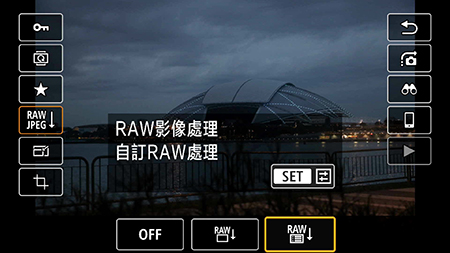 1.在回看模式中,按下SET按鈕移動到 RAW 圖像處理標誌。選擇最右邊的標誌,來自訂 RAW 格式處理。