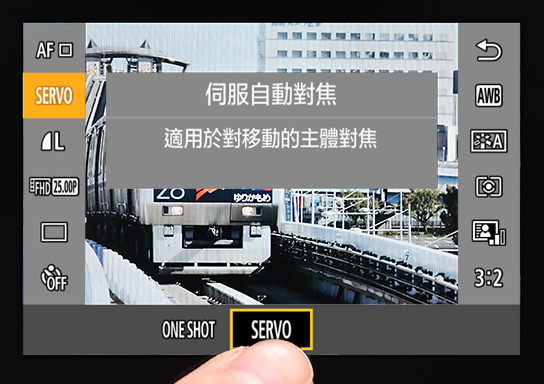 2.在自動對焦模式中選擇「SERVO」(伺服)。