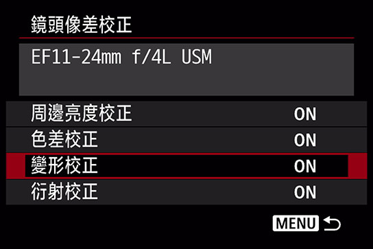 這個選單可供修正任何因鏡頭的光學特性引起的影響。外圍光量、色差及衍射校正預設為[啟用],變形校正設為[停用]。