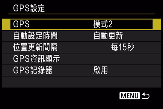 GPS記錄功能有兩種模式。在模式一中,即使相機電源關閉,GPS訊號亦會以週期性間隔接收,一旦相機電源開啟便會存儲資訊。在模式二中,當相機電源關閉時,GPS記錄功能亦會關閉。如已啟用GPS記錄器功能,相機會定時取得位置資料,讓您利用Map Utility軟件在地圖上展示相機覆蓋的路線。