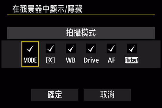您亦可透過觀景器顯示改變拍攝模式、測光模式、白平衡、驅動模式、自動對焦操作及閃爍偵測的設定。