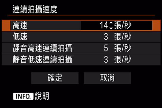 在觀景器拍攝下,連拍速度可自由設定為每秒2至14張;在實時顯示拍攝下,則可設定為每秒16張及每秒2至14張之間。