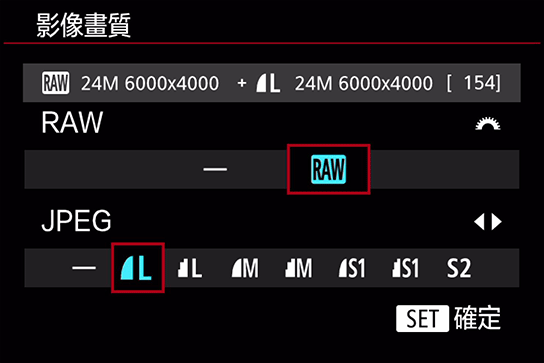 您可以選擇四種尺寸中的其中一種來拍攝:L:約2400萬像素(6,000 x 4,000)、M:約1060萬像素(3,984 x 2,656)、S1:約590萬像素(2,976 x 1,984)及S2:約380萬像素(2,400 x 1,600)。您可以同時以RAW格式記錄影像。RAW格式影像拍攝則只有一種尺寸可選:2400萬像素。