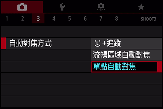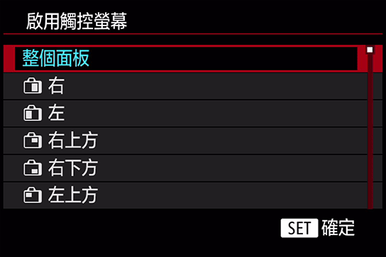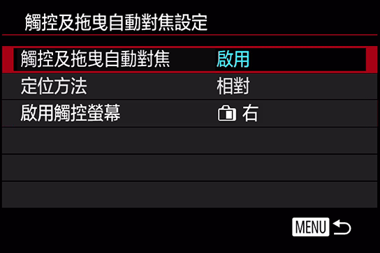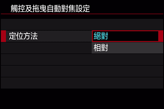 觸控及拖曳自動對焦功能預設為停用,但我們建議啟用它。液晶螢幕上的啟用觸控範圍亦可進一步設置。如果您希望像多功能控制器般使用觸控及拖曳自動對焦功能,應在[定位方法]中選擇[相對],並在[啟用觸控螢幕]中選擇[右]。