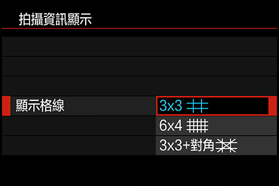 3. 在拍攝選單一選擇「拍攝資訊顯示」→「顯示格線」→「3x3」。
