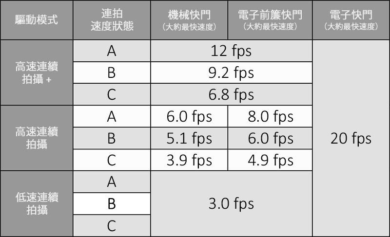 *機械快門/電子前簾快門的實際連拍速度取決於多種因素,比如電池類型/剩餘電量、溫度、內置 Wi-Fi (開或關)、減少閃爍、快門速度、光圈值、鏡頭類型等。欲瞭解更多資訊,請參閱使用者手冊。