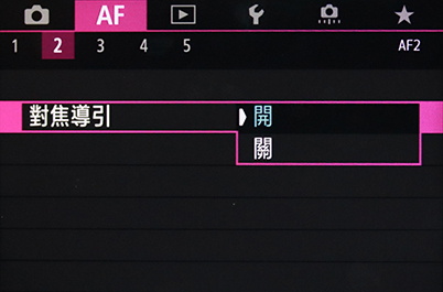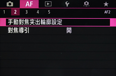 在 EOS R、EOS R5 和 EOS R6 系列,峰值手動對焦和對焦指引就在自動對焦選單 2。