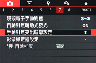 如果相機沒有自動對焦選項卡,那麼峰值手動對焦功能就放在 SHOOT 選單。在 EOS M50 系列裡,可在 SHOOT 選單 7 找到。