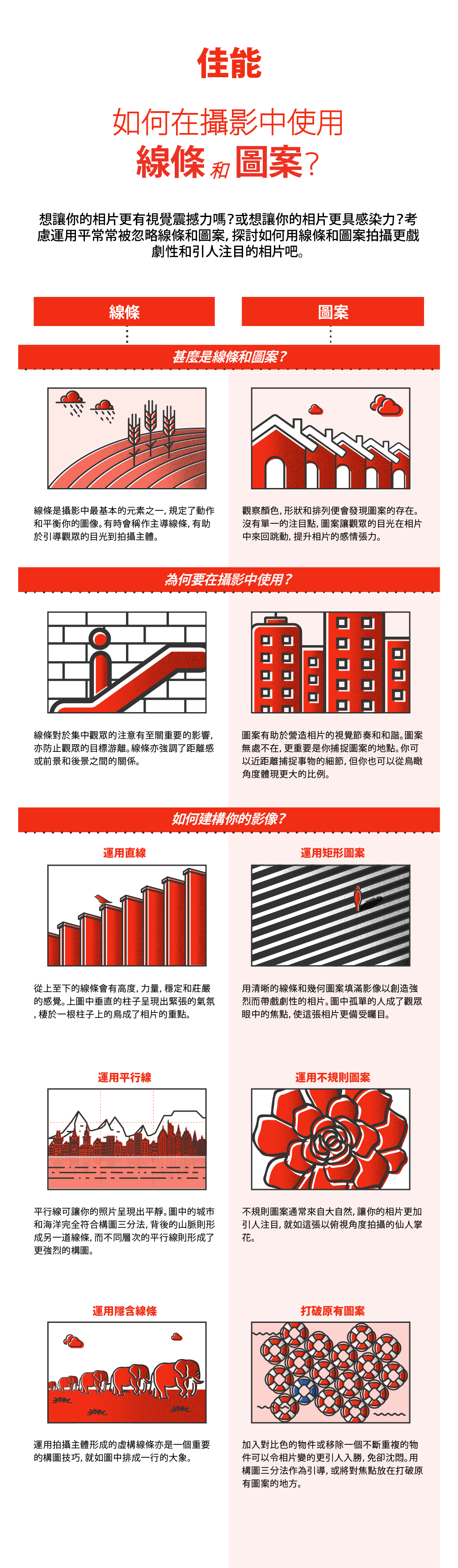 當你進行外景拍攝時,你所識別出的線條或圖案會為照片增加流動力或節奏感,甚至還可以創造戲劇性和緊張感,使你拍攝出具有視覺衝擊感的照片。本資訊圖表會讓你輕鬆掌握如何在戶外拍攝中結合線條或圖案,來提高你的攝影水準。