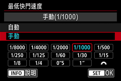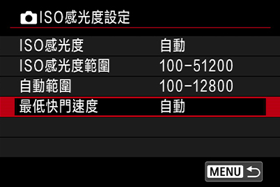 這一項設定好後,只要是在 Av 或 P 模式,同時使用 ISO 自動,那麼相機設定的 ISO 感光度將不會導致快門慢於所設定的值。