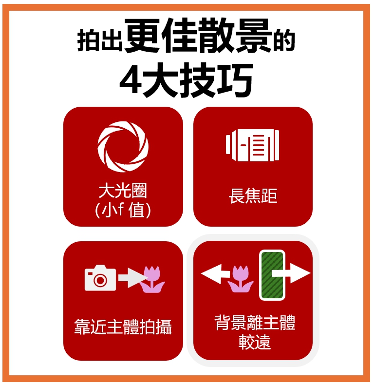 - 調整角度/主體/背景,讓背景盡可能遠離主體。