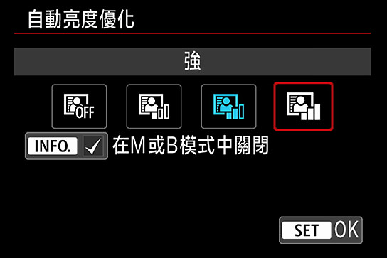 按「快速控制」按鈕顯示「自動亮度優化」功能,而當您將其設置為「弱」或「強」時,變更會立即反映在預覽影像中,因此很容易在即時顯示功能中看到各效果之間的差異。