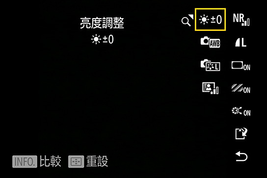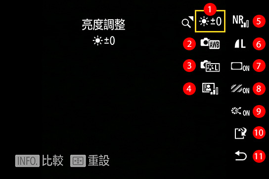 1. 亮度調整:EV-1、EV-2/3、EV-1/3、EV±0、EV+1/3、EV+2/3、EV+1