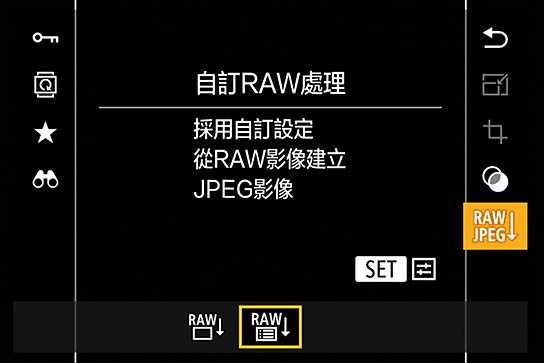 2. 按下[Set]按鈕,選擇[RAW JPEG]後選擇[自訂RAW處理],再按下[Set]按鈕。