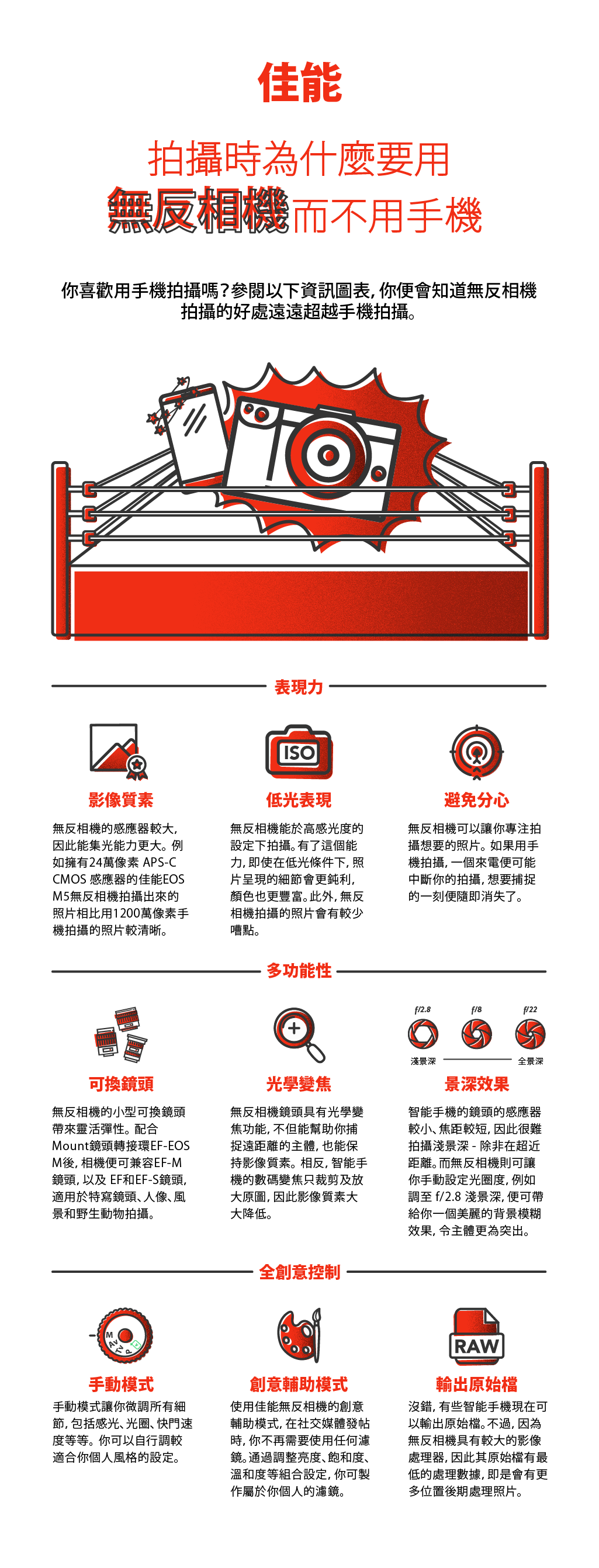 用智能手機拍照不但方便易用,而且性能也愈來愈好,這是否代表你只需要擁有一部擁有拍攝功能的手機便足夠?參閱以下資訊圖表,你便會發現為什麼你應該從智能手機升級,轉用無反相機拍攝。